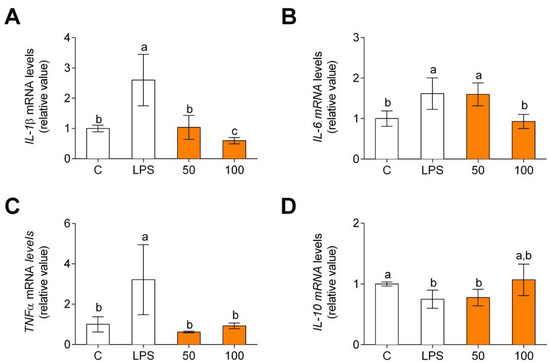 Pro-inflammatory (A–C) and anti-inflammatory (D) cytokine gene expression in human primary LPS-stimulated monocytes after CPH treatment at 50 and 100 μg/mL for 24 h. The values are presented as means ± SD (n = 3). Different letters denote statistical differences (p < 0.05).