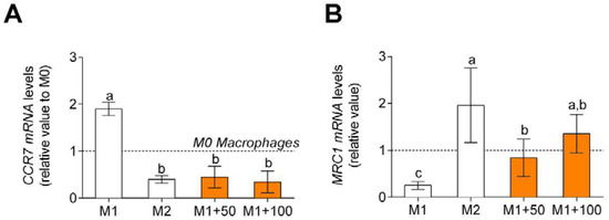 Macrophage polarization marker gene expression, CCR7, M1 polarization marker (A) and MRC1, M2 polarization marker (B). M0 macrophages were incubated with LPS + IFNγ (M1 control), IL-4 (M2 control), or LPS + IFNγ + CPH (50 and 100 μg/mL for 24 h). Values are presented as means ± SD (n = 3). Different letters denote statistical differences (p < 0.05).