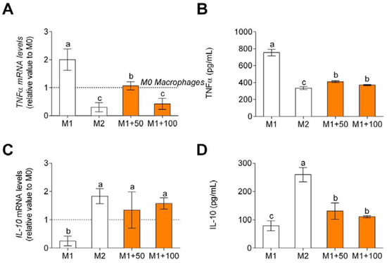 TNFα, M1 macrophage polarization-associated cytokine, gene expression (A), and release (B) and IL-10, M2 macrophage polarization-associated cytokine, gene expression (C), and release (D). M0 macrophages were incubated with LPS + IFNγ (M1 control), IL-4 (M2 control), or LPS + INFγ + CPH (50 and 100 μg/mL for 24 h). Values are presented as means ± SD (n = 3). Different letters denote statistical differences (p < 0.05).