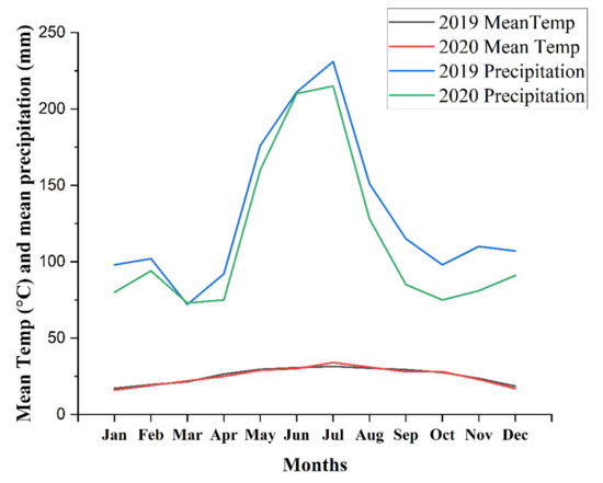 A two-year field experiment was conducted in Nanning, Guangxi, with different BC and N fertilizer treatments in 2019 and 2020. The climate onsite is subtropical monsoon, and the data on mean temperature and mean precipitation are represented in Figure 1. The soil (0–20 cm) is graded as Ultisols and is slightly acidic (pH 5.94), soil organic carbon (SOC) 15.10 g kg−1, soil organic matter 25.8 g kg−1, total N (TN) 1.35 g kg−1, available N (AN) 134.7 mg kg−1, available phosphorous (23.1 mg kg−1), and available potassium (AK 233.6 mg kg−1, with 1.36 g cm−3 soil bulk density (BD).