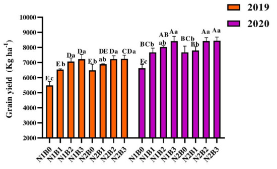 Effect of biochar and nitrogen fertilizer on grain yield. Bars represent the standard errors of the means. Different small and capital letters show significant differences between the treatments within the same year and between the years in the same treatment, respectively, via LSD test at p ≤ 0.05. N1 and N2 represent 135 and 180 kg ha−1 nitrogen; B0, B1, B2, and B3 represent 0-, 10-, 20-, and 30-ton biochar ha−1.