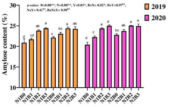 Changes in amylose content of rice in response to different biochar and nitrogen fertilizer. Different letters above the column are significantly different from each paper. Bars represent the standard errors of the means. ** and * on the B, N, and Y indicate significance at the 0.01 and 0.05 probability levels, respectively. ns: non-significant. Columns with different letters are significantly different at p < 0.05. N1 and N2 represent 135 and 180 kg ha−1 nitrogen; B0, B1, B2, and B3 represent 0-, 10-, 20-, and 30-ton biochar ha−1.