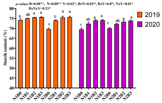 Changes in starch content of rice in response to different biochar and nitrogen fertilizer. Bars represent the standard errors of the means. ** and * on the B, N, and Y indicate significance at the 0.01 and 0.05 probability levels, respectively. ns; non-significant. Columns with different letters are significantly different at p < 0.05. N1 and N2 represent 135 and 180 kg ha−1 nitrogen; B0, B1, B2, and B3 represent 0-, 10-, 20-, and 30-ton biochar ha−1.