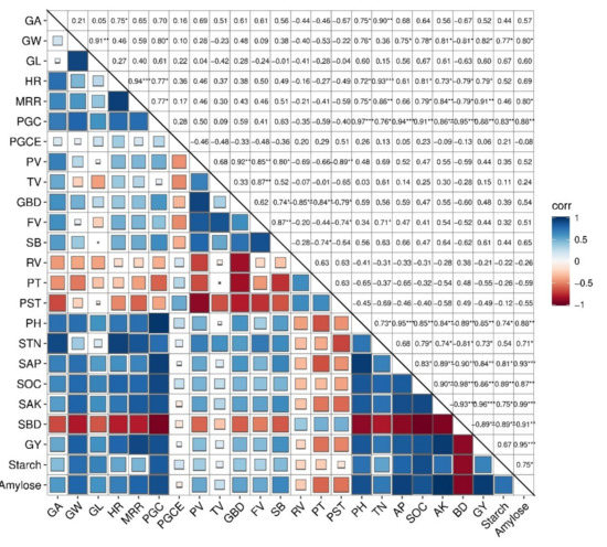 Correlations heat map of soil properties, grain appearance quality, milling quality, and RVA profile of rice using R software. Square with red to dark blue color indicates the relationship from negative to positive. Square size from small to big indicates the moderate positive/negative to strongly negative/positive relationship. The values in the figure showed the R-squared values. AP, available phosphorus; SOC, soil organic carbon; TN, total nitrogen; AK, available potassium; BD, bulk density; PV, peak viscosity; TV, trough viscosity; BD, break down; FV, final viscosity; SB, set back; RV, reply value; PT, peak-time; PST, pasting-temperature; GA, grain area; GW, grain width; GL, grain length; HR, head rice; MRR, milled rice rate; PGCE, percent area of chalkiness endosperm (%); PGC, percent grains with chalkiness; GY, grain yield. *, ** and *** show statistical significance at p>0.05, p>0.01 and p>0.001, respectively.