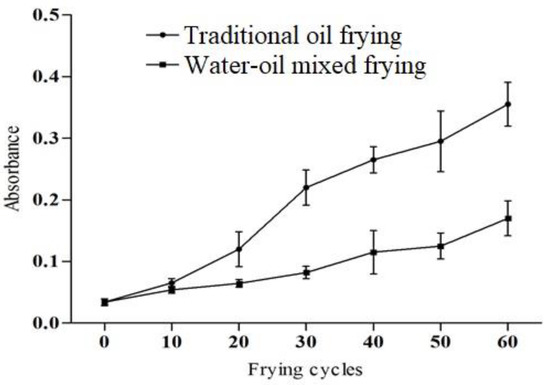 The soybean oil color change corresponding to the frying methods and frying cycles is shown in Figure 1. The absorbance of the samples fried with the water–oil mixed frying method is lower than that of the traditional frying method. In the previous studies, it is reported that the darkening of the color might be due to the availability of non-volatile degradation products including oxidized triglycerides and polymers [19,20]. Interaction of food nutrients also causes Maillard reaction and browning products contributes to the darkening [21].