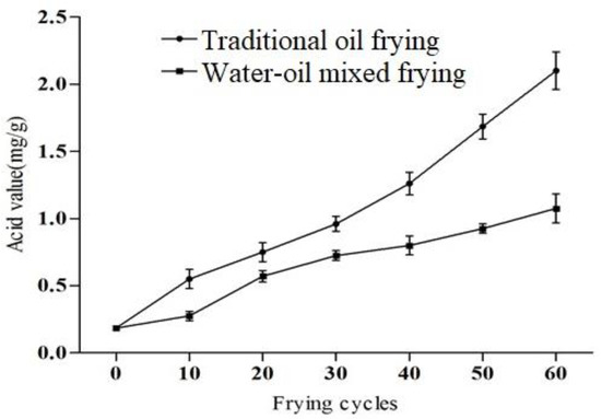 Oils and fats are hydrolyzed at high temperatures to produce free fatty acids, this in turn accelerates the rancidification, which is primarily determined by acid value [22]. The acid value of fried soybean oil was increased considerably with the number of frying cycles in both frying methods (p < 0.05). Figure 2 shows that the increased acid value was faster under traditional oil frying conditions than the water–oil mixed frying method during 60 frying cycles. The acid value of the oil was 2.10 mg/g when using the former method and 1.08 mg/g when using the latter method (11.05- and 5.68-fold greater, respectively, than the original content (0.19 mg/g). None of the acid values in this work exceeded the 3 mg/g limit specified in the GB2716-2005 protocol. Moreover, observed findings for acid value is also as per recommendation (<3) by the Food Sanitation Act, Japan [23]. After 40 frying cycles, the acid value of the traditional fried soybean oil was significantly higher than the water–oil mixed frying and this difference between the two values gradually expanded with the increasing frying cycles. A similar increasing trend was recorded in the previous study; the acid value of the soybean oil was increased from 0.47 to 5.14 after 1–101 frying cycles [24]. During processing in the frying oil, the acid value was increased maybe due to oxygen, steam and water initiated chemical reactions [25]. Furthermore, chemical composition of fats and oils also have a role in oxidative changes [24].