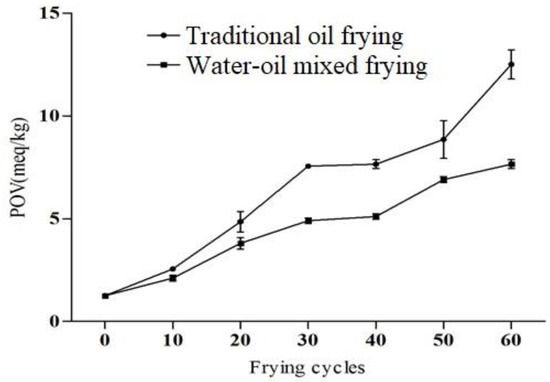 Peroxide value (POV) of soybean oil under different frying methods and frying cycles.