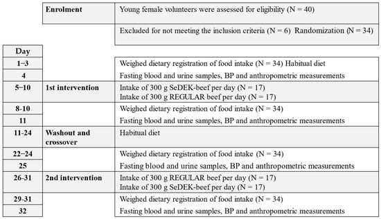 The aim of this double-blind cross-over (6-days × 2) intervention study in young female volunteers was as follows: (1) study the effects of ingesting 300 g of beef a day from bulls fed concentrate supplemented with extra vitamin D, E, K, n-3, and selenium (SeDEK-beef) compared to the regular composite feed (REGULAR); (2) compare the ‘300 g beef’ diet with the habitual normal diet of the young healthy participants.