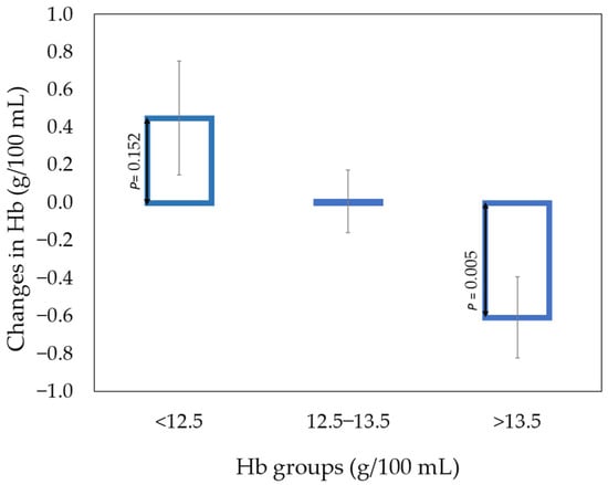 Hb showed large variations (ranging from 11.4–15.5 g/100 g of blood at baseline), and the high blood Hb group revealed a significant decrease in Hb blood (Figure 2). The hemoglobin concentration for participants with <12.5 g Hb/100 mL blood (eight of 34 persons) numerically increased by consuming 300 g beef per day compared to eating the habitual diet (Figure 2). The average increase was 0.1 mg Hb/100 mL of blood per day.