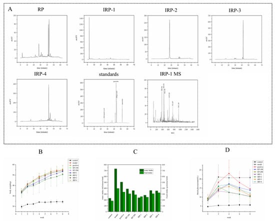 HPLC analysis of RP, IRP 1–4, standard reference samples, and effects of RP and IRP 1–4 on weight, food and water intake, FBG in db/db mice of 0 and 8 weeks. (A) HPLC of total phenolic compounds (RP) in RRT and the 4 main components isolated from RP. Effects of RP and IRP 1–4 on the body weight (B), food intake and water intake (C), and fasting blood glucose (D) in the db/db mice. All data are presented as the means ± SD (n = 6) except food and water intake.