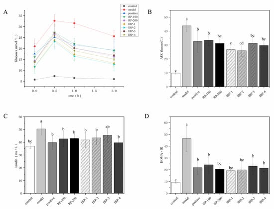 Effects of RP and IRP 1–4 on glucose intolerance and ameliorated insulin resistance in db/db mice. (A) oral glucose tolerance test, (B) AUC of glucose, (C) fasting serum insulin concentrations, (D) HOMA-IR. Data are presented as mean ± SD (n = 6). Different letters (superscripts a–e) are significantly different at p < 0.05.
