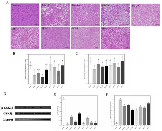 Effects of RP and IRP 1–4 on Micromorphology of Liver, hepatic glycogen content, muscle glycogen content, and GSK3β protein expression in db/db mice. (A) H&E staining of the liver (×200 magnification), (B) hepatic glycogen content, (C) muscle glycogen content. (D) Representative Western blots depict p-GSK3β, GSK3β, and GADPH. (E) RP and IRP 1–4 decreased the GSK3β protein level. (F) RP and IRP 1–4 increased p-GSK3β/GSK3β. All data were expressed as mean ± SD (n = 6). Different letters indicate a significant difference (p < 0.05).