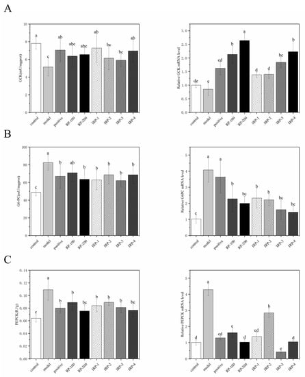 Effects of RP and IRP 1–4 on hepatic gluconeogenesis in T2DM mice. RP and IRP 1–4 increased the activities of GCK (A) and decreased the activities of G6PC (B) and PEPCK (C). RP and IRP 1–4 increased the relative mRNA levels of GCK (A) and reduced the relative mRNA levels of G6PC (B), and PEPCK (C). All data were expressed as the means ± SD (n = 6). Different letters indicate a significant difference (p < 0.05).
