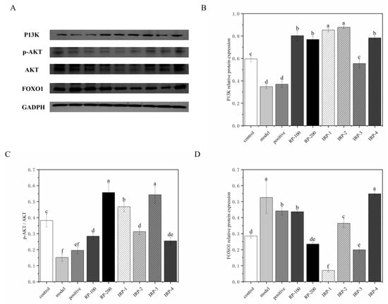 Effects of RP and IRP 1–4 on the PI3K/AKT/FOXO1 insulin signaling pathway in db/db mice. (A) Representative Western blots depicting P13K, p-AKT and total AKT, FOXO1, and GADPH. (B–D) RP and IRP 1–4 increased the relative protein expression of P13K (B) RP, and IRP 1–4 increased p-AKT/AKT (C) RP and IRP 1–4 decreased the relative protein expression of FOXO1 (D). All of the samples were evaluated in triplicate. All data are presented as mean ± SD (n = 6). Different letters indicate a significant difference (p < 0.05).