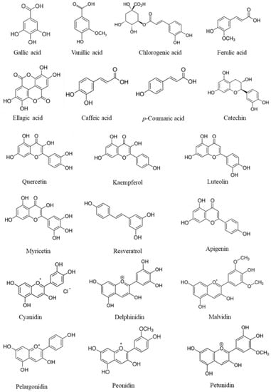 There are many criteria to classify or distinguish phenolics, however, the most commonly used is the division of phenolics into flavonoids and non-flavonoids. According to Działo et al. [85], flavonoids are based on two aromatic rings connected by a bridge consisting of three carbons (C6-C3-C6), which are divided into six main sub-classes: flavonols, flavones, flavanones, flavan-3-ols, isoflavones, and anthocyanidins. In nature, flavonoids occur usually in association with sugar as glycosides. The second class of phenolics is the non-flavonoid molecules [85], which can be divided into 3 subgroups: phenolic acids, lignans (C6-C3)2, and stilbenes C6-C2-C6 [86]. Phenolic acids can be divided into two categories: hydroxybenzoic (C6-C1) acid derivatives and hydroxycinnamic (C6-C3) acid derivatives. The first group includes molecules such as hydroxybenzoic, gallic, vanillic, and ellagic acid, and in the second group p-coumaric, caffeic, ferulic, and chlorogenic acids are the most representative [87]. Flavonoids include catechin, quercetin, kaempferol, luteolin, and myricetin, as the most relevant compounds [85,87,88]. Anthocyanidins include cyanidin, delphinidin, malvidin, pelargonidin, peonidin, and petunidin as the most representative molecules [87,89]. Figure 3, illustrates the chemical structures of the most common phenolics found in fruits.