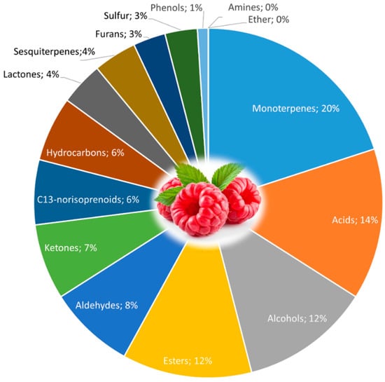 Raspberry volatiles are important for the perception of their sensory quality and mold resistance [172], Figure 5. As to other fruits, volatile compounds are influenced by numerous factors including ripeness, climate, soil, cultivar variation, among others [173].