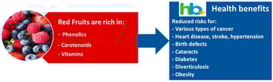 Nowadays, people are concerned about having a varied and healthy diet. Therefore, the acceptability and consumption of red fruits, especially the species of several families, such as Rosaceae (strawberry, raspberry, blackberry, and sweet cherry), and Ericaceae (blueberry, cranberry) has undergone significant increases not only due to their high nutritive value, characteristic taste, flavor and nutraceutical characteristics, but also due to their known health-promoting properties (as dietary sources of bioactive compounds) [1,2,3,4,5]. There is the recognition that red fruits are a good source of many bioactive ingredients and nutrients, including vitamins (vitamins A, C, and E), minerals (calcium, phosphorus, iron, magnesium, potassium, sodium, manganese, and copper), dietary fiber, and antioxidants [1,3]. They are also a rich source of bioactive compounds, and studies have shown that they have essential positive effects on the human diet and health, which could be mainly ascribed to the presence of several health-related compounds such as organic acids, phenolics, and sugars (glucose, fructose) [6,7,8]. Intake of fresh fruits enhanced both mental and physical health and facilitated the prevention of various non-communicable diseases as well, such as neurological disease, cardiovascular disease, diabetes mellitus, obesity, osteoarthritis, and some cancers [8]. For example, Huang et al. [9] showed that strawberries are a rich source of anti-inflammatory polyphenols such as anthocyanins, which have been shown to decrease the postprandial meal-induced increases in inflammation and oxidative stress in overweight healthy adults, mainly if the strawberry drink was consumed before the meal. In addition, the ease of transport due to their size makes them even more recommendable to be consumed in all situations. The qualitative and quantitative composition, the nutritional value, and consumer’s acceptability of the fruits in general and the red fruits, in particular, will vary with the species, cultivar, genotype, maturity stage, agricultural practice, environmental conditions, plant nutrition, soil conditions as well as subsequent storage conditions [3,4,5,6,7,8,9,10,11,12,13,14,15,16]. This review aims to summarize and update knowledge concerning the composition of red fruits and to describe the most recent research regarding the health benefits of some selected red fruits.
