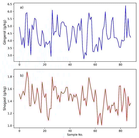 The gingerols and shogaols were extracted using protocols previously reported for this purpose [,,]. Approximately 0.5 g of powdered ginger sample was suspended in 7 mL of 90% aqueous methanol and mixed end-over-end for 60 min. Following centrifugation (1000× g; 10 min), the supernatant was collected and the pellet extracted again with 7 mL of 90% methanol and mixed end-over-end for 20 min. The combined supernatants were made up to 15 mL with 90% methanol and syringe filtered (LabServ 0.2 µm nylon membrane) prior to direct HPLC analysis. Extractions and HPLC analyses were performed on each of the 89 samples in duplicate. The mean value obtained was used in subsequent statistical analyses and modelling.