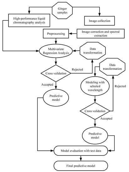 As it is recommended that several types of pre-processing be used when developing multivariate calibration models [], a number of pre-processing methods were trialled in this study, including standard normal variate (SNV), multiplicative scatter correction (MSC), mean filter with 5 × 5 window size (MF5), mean filter with 9 × 9 window size (MF9), and the first and second derivatives calculated using Savitzky-Golay smoothing (1D and 2D SG) [,,]. The performance of each model created was evaluated in order to determine the optimal pre-processing method for the prediction of the ratio of 6-gingerol and 6-shogaol in dried ginger powder.