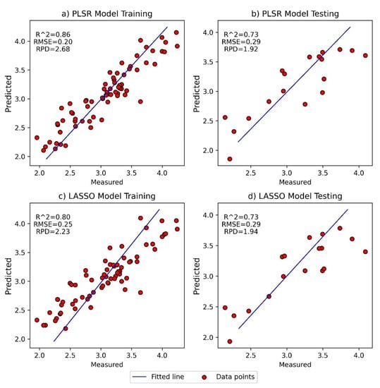 The predictive ability of a developed model is evaluated by the coefficients of determination (R2) and RMSE of the training and testing dataset [,,]. The ratio of performance to deviation (RPD) may also be used to further assess the reliability of the predictions [,,]. The study in [] suggested that the predictive ability of a model could be considered ‘good’ when RPD values exceed 1.4. The R2, RMSE, and RPD are calculated using the following equations: