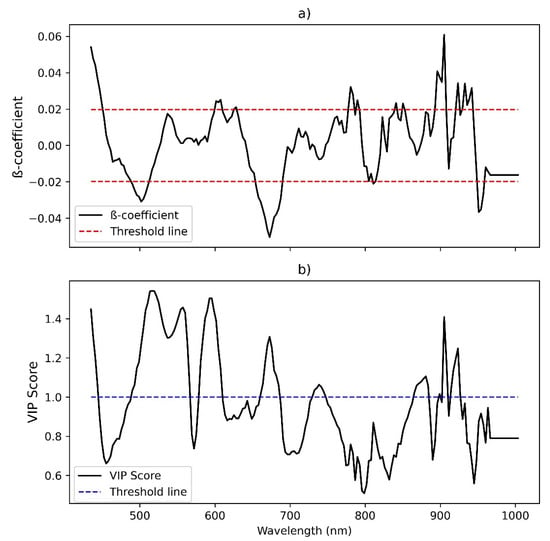 VIP is another method often used for providing valuable insight into the most effective spectral regions by finding informative wavelengths [,,,]. The VIP method selects variables by first calculating the VIP score–an accumulation of the importance of each variable to each component in the PLSR model. All variables with VIP scores below a certain threshold are then excluded. In this study, the threshold value was set to 1, based on the recommendations of previous studies [,].