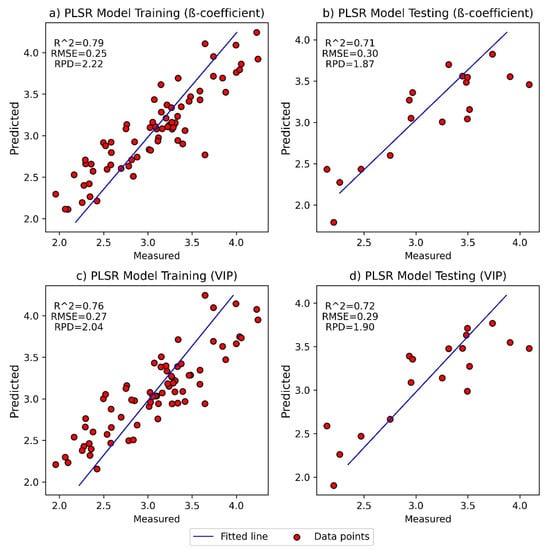 Subsequently, the selection of important wavelengths was performed to determine if this improved the prediction accuracy of the models. A total of 16 models were developed using the β-coefficient and VIP wavelength selection methods (see Tables S2 and S3 in the Supplementary File). When the β-coefficient method was performed, four of the eight models were poor (RPD < 1.4), and only two models (RPD ≥ 1.4) showed good agreement when the VIP method was applied. The best model for both methods was found when using the 2D-SG pre-processing technique (R2 ≥ 0.71, RMSE ≤ 0.30, and RPD ≥ 1.87 for PLSR β-coefficient, and R2 ≥ 0.72, RMSE ≤ 0.29, and RPD ≥ 1.90 for PLSR VIP). For the PLSR models, the number of wavelengths was successfully reduced to 53 and 71, using the β-coefficient and VIP variable selection methods, respectively (Figure 6).