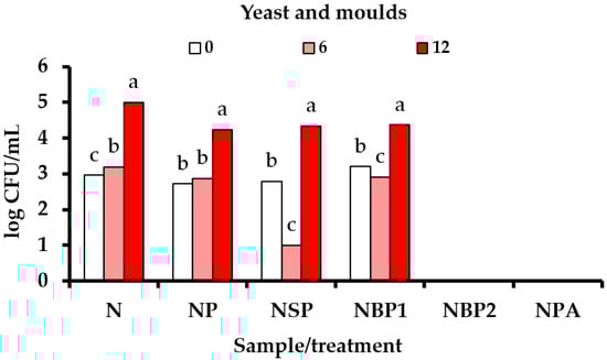 The average counts (log CFU/mL) of yeast and moulds in rose hip nectars during 12 days of refrigerated storage. Data were analysed by post-hoc Tukey test, with the significance defined at p < 0.05.