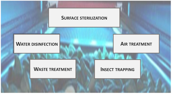 Waste treatment: Another application of UV radiation has been the elimination of undesirable volatile organic compounds (VOCs) in industrial exhausts [29,30]. This has been achieved through advanced oxidation processes combining UV radiation with photocatalysts, such as TiO2 [9,31]. This strategy generates highly oxidative environments, which facilitates the degradation of unwanted molecules [32].