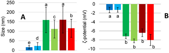 (A) Hydrodynamic diameter (nm) and (B) ζ-potential (mV) of FG (■ untreated, ■ treated), PPI (■ untreated, ■ treated) and MIX (■ untreated, ■ treated). Values are here reported as the average of three replicates and their standard deviation is shown in the error bars. a–e, different letters show significant differences (p < 0.05).