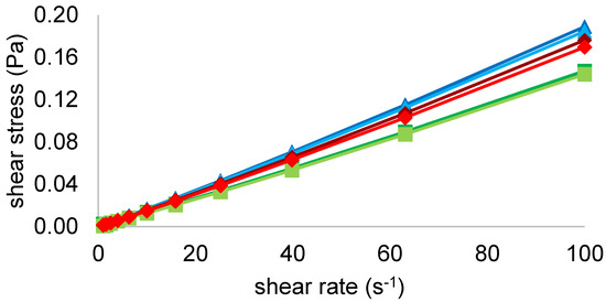 The rheological properties of the solutions were evaluated with a controlled-stress rheometer (StressTech HR Cannon instruments, State College, PE, USA) equipped with a double gap geometry. A volume of 15 mL was analyzed 20 °C. Oscillatory measurements were used as a first step to find the linear viscoelastic region (LVR), which indicates a Newtonian behavior. LVR was found within a shear rate between 1–100 s−1, which was used for the flow measurements. Flow data were fitted with the Power-law model and the apparent viscosity of the sample solutions was obtained using the following equations: