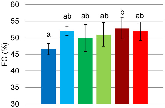 FC (%) of FG (■ untreated, ■ treated), PPI (■ untreated, ■ treated) and MIX (■ untreated, ■ treated). Values are here reported as the average of three replicates and their standard deviation is shown in the error bars. Different letters show significant differences (p < 0.05).