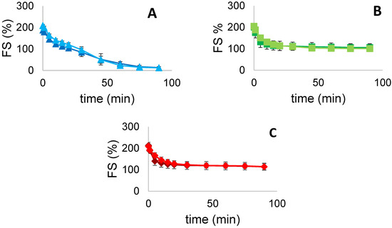 FS (%) over time (min) for (A) FG (■ untreated, ■ treated), (B) PPI (■ untreated, ■ treated) and (C) MIX (■ untreated, ■ treated). Values are here reported as the average of three replicates and their standard deviation is shown in the error bars.