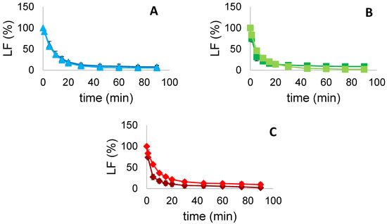LF (%) over time (min) for (A) FG (■ untreated, ■ treated), (B) PPI (■ untreated, ■ treated) and (C) MIX (■ untreated, ■ treated). Values are here reported as the average of three replicates and their standard deviation is shown in the error bars.