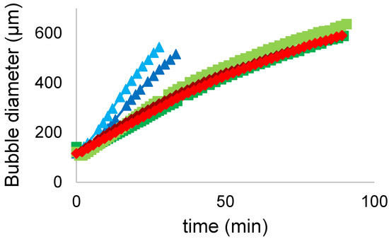 Bubble mean diameter (µm) evolution over time (min) of FG (■ untreated, ■ treated), PPI (■ untreated, ■ treated) and MIX (■ untreated, ■ treated).