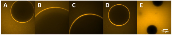 CLSM images of PPI (A,B) and MIX (C,D) samples. To discriminate the fluorescent protein layer around each air bubble, a comparison with soap bubbles with no protein content (E) has been carried out.