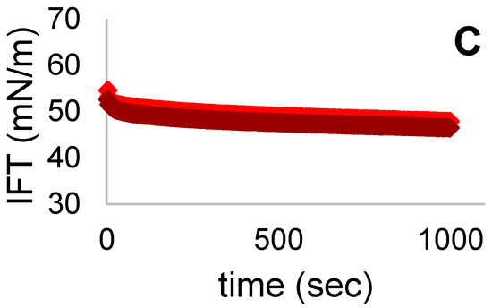 IFT values (mN/m) over time (sec) for (A) FG (■ untreated, ■ treated), (B) PPI (■ untreated, ■ treated) and (C) MIX (■ untreated, ■ treated).