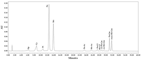 HPLC-DAD anthocyanin profile of SB2 Sugranineteen at DOY 280 (harvest). Dp, delphinidin-3-O-glucoside; Cy, cyanidin-3-O-glucoside; Pt, petunidin-3-O-glucoside; Pn, peonidin-3-O-glucoside; Mv, malvidin-3-O-glucoside; Pn-Ac, peonidin-3-O-acetyl-glucoside; Mv-Ac, malvidin-3-O-acetyl-glucoside; Pn-Cf, peonidin-3-O-caffeoyl-glucoside; Mv-Cf, malvidin-3-O-caffeoyl-glucoside; cis-Pn-Cm, cis-peonidin-3-O-coumaroyl-glucoside; cis-Mv-Cm, cis-malvidin-3-O-coumaroyl-glucoside; Pn-Cm, peonidin-3-O-coumaroyl-glucoside; trans-Mv-Cm, trans-malvidin-3-O-coumaroyl-glucoside.