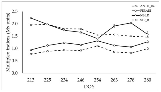 Changes in fluorescent indices (Mx units) of Sugranineteen clusters during ripening (day of the year, DOY).