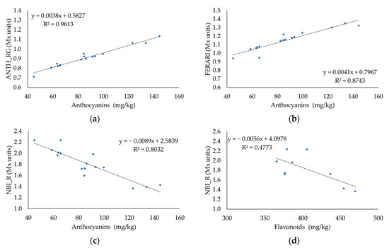 Regression model analyses were conducted to study the relationship between the different grape maturity parameters analyzed destructively and the fluorescent measurements collected by Multiplex® 3 along the maturation season. Regression equations with the corresponding coefficient of determination (R2) are shown in Figure 3 and Table S1. The indices ANTH_RG and FERARI showed a significant relationship with skin anthocyanins (p < 0.001) and fitted a positive linear model, with R2 values equal to 0.9613 and 0.8743, respectively. The NBI_R index that is correlated to the epidermal phenolics and chlorophyll revealed significant negative linear relationships with anthocyanins (R2 = 0.8032; p < 0.001) and flavonoids (R2 = 0.4773; p = 0.039). Among the technological maturity parameters, TA, CIRG, and TSS were significantly related to the simple fluorescent index SFR_R that is associated with the chlorophyll content of berries, with R2 values equal to 0.6186 (p = 0.012), 0.7835 (p = 0.005), and 0.7954 (p = 0.001), respectively. The FLAV index that is correlated to flavonols did not show a significant relationship when compared with flavonoid content (Table S1).
