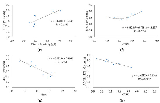 Regression models reflecting the relationships between different grape maturity parameters and the fluorescent measurements collected by Multiplex® 3 along the maturation season: (a) relationship between ANTH_RG (Mx units) and anthocyanins (mg/kg) (n = 16); (b) relationship between FERARI (Mx units) and anthocyanins (mg/kg) (n = 16); (c) relationship between NBI_R (Mx units) and anthocyanins (mg/kg) (n = 16); (d) relationship between NBI_R (Mx units) and flavonoids (mg/kg) (n = 9); (e) relationship between SFR_R (Mx units) and titratable acidity (g/L) (n = 9); (f) relationship between SFR_R (Mx units) and CIRG (n = 10); (g) relationship between SFR_R (Mx units) and TSS (°Brix) (n = 9)); (h) relationship between ANTH_RG (Mx units) and CIRG (n = 7). Each dot represents the mean value of triplicates of laboratory analyses and the relative 196 in-vineyard-collected fluorescent measurements.