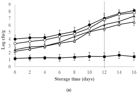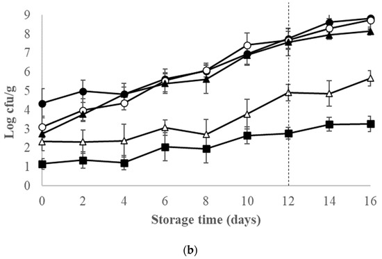 Microbiological changes (TVC (●), Pseudomonas (○), H2S-producing bacteria (▲), LAB (Δ) and Enterobacteriaceae (■)) of red seabream stored in ice. Each data point and the error bars show the mean and ±st. dev. of 4 replicates (4 fish per batch). The vertical dashed lines indicate the end of shelf-life of the whole red seabream from (a) batch 1 and (b) batch 2, stored in ice.