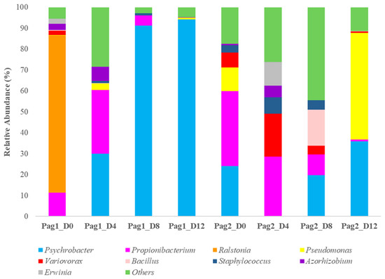 According to metataxonomic analysis, two bacterial phyla, Proteobacteria and Actinobacteria, dominated during whole storage time, while Firmicutes and Bacteroides were found to a lesser extent and in traces, respectively (Figure S2). In all samples, Proteobacteria was the most abundant phylum, while at the end of shelf-life (D12), their relative abundance exceeded more than 90% in both batches. However, the presence of Firmicutes in D8 of the second batch (Pag2_D8) is also noteworthy.