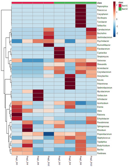 Based on the clustering heatmap plot (Figure 3), a clear distinction between fresh and spoiled sample profiles was observed, because several genera (i.e., Azorhizobium, Erwinia, Vibrio, Ralstonia, Enzhydrobacter, Flavobacterium, Cypriavidus, Streptomyces, Propionibacterium, Staphylococcus, Pandoraea) were closely related to the initial stages of storage (D0-D4), while specific bacteria (i.e., Carnobacterium, Brochothrix, Janthinobacterium, Shewanella, Psychrobacter, Pseudomonas) were linked with the end of red seabream’s shelf-life. Notwithstanding that, besides the well-shared bacteria, a noteworthy different profile was observed between the two batches during the whole storage period. For instance, Flavobacterium and Streptomyces solely existed at the initial stage of storage (D0) of batch 2, while Shewanella and Corynebacterium were only related to the end of shelf-life of batch 2. Regarding the key spoilage players, Psychrobacter was more linked with the end of shelf-life of batch 1, while conversely, Pseudomonas was more related to batch 2.