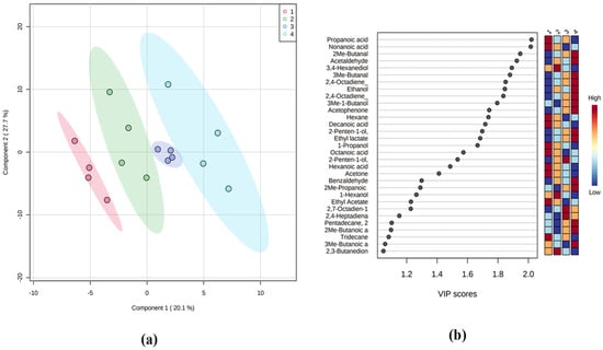 (a) PLS-DA modelling of the volatile compounds’ variations during storage of red seabream on ice. The legend indicates days of storage: 1-Day, 0; 2-Day, 4; 3-Day, 8; 4-Day, 12. The percentage of the explained response variance is indicated in parentheses. The shaded ellipses correspond to the 95% confidence regions of each class. (b) Volatile compounds with VIP > 1. Colour bars show the normalized content of the volatile compound in the respective class.