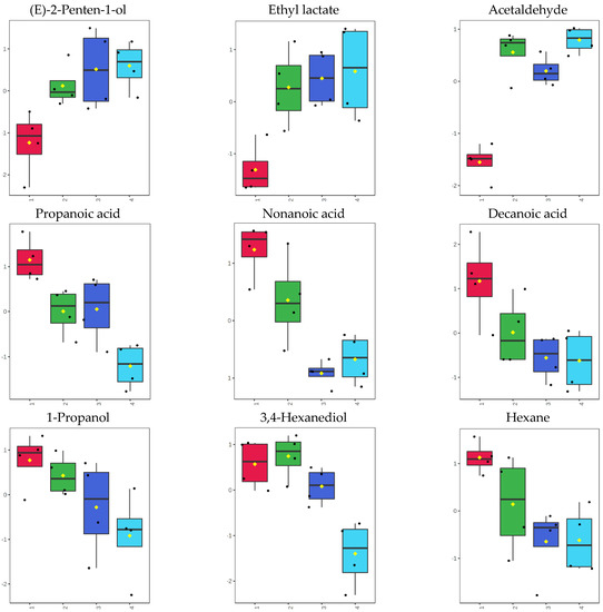Volatile compounds that either increased or decreased significantly (according to the combined result of PLS-DA and Spearman’s correlation analysis) during storage of red seabream in ice. The numbers (1, 2, 3, 4) on the x-axis represent sampling points which are equivalent to the days of storage (D0, D4, D8, D12, respectively) on ice. y-Axis denotes normalized content after log10 transformation and autoscaling.