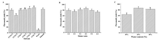 Effects of composition (A), molar ratio (B), and water content (C) of the NADES on flavonoid yield. (Bars with different letters differ significantly at p < 0.05).