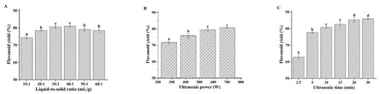 Effects of liquid-to-solid ratio (A), ultrasonication power (B), and ultrasonication time (C) on ultrasound-assisted extraction of flavonoids. (Bars with different letters differ significantly at p < 0.05).