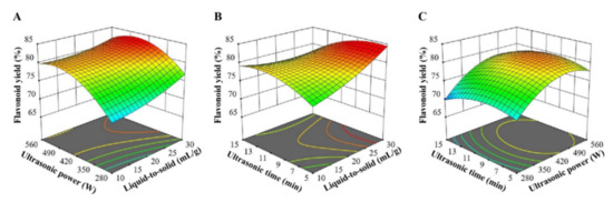 Response surface plots for ultrasound-assisted extraction of flavonoids from Ampelopsis grossedentata leaves; the interaction between ultrasonic power and liquid-to-solid ratio (A), ultrasonic time and liquid-to-solid ratio (B), ultrasonic time and ultrasonic power (C).