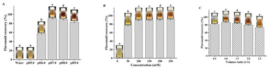 Effects of pH (A), concentration (B), and PBS addition amount (C) on flavonoid recovery. (Bars with different letters differ significantly at p < 0.05).