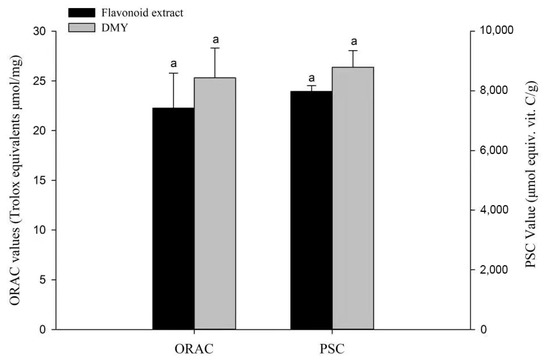 Many phytochemicals, such as phenolic acids and flavonoids, contribute to the antioxidant characteristics of fruits and vegetables, and their potential nutritional value and safety have been widely assessed [35]. The previous report reported the superior antioxidant activity of the extract of Ampelopsis grossedentata leaves [36]. Due to the complex reaction mechanisms of phytochemicals, it is necessary to study their antioxidant activity using accurate and multiple evaluation methods. Considering this, we used PSC and ORAC chemical antioxidant assays in this study. As shown in Figure 5, the antioxidant performance of DMY was slightly superior to that of the flavonoid extract, which coincided with a previous report that showed that DMY possessed higher antioxidant activity than the water extract of Ampelopsis grossedentata leaves [19].